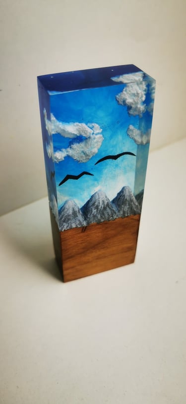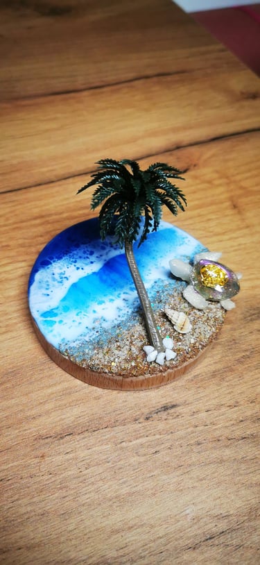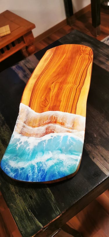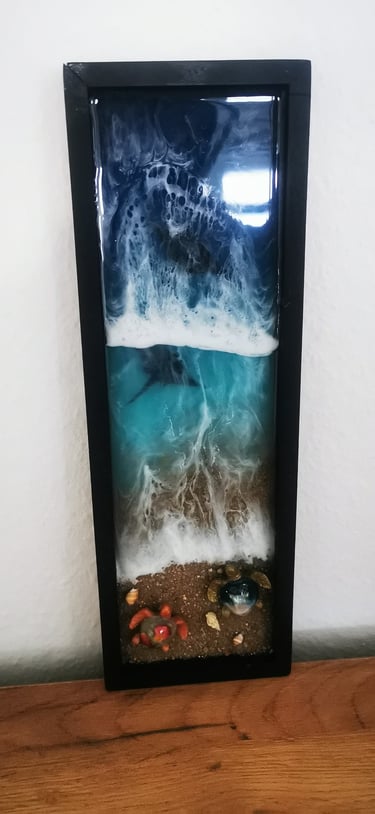 Ročno izdelana umetnost iz epoksi smole, združena z naravnim lesom in pravim peskom